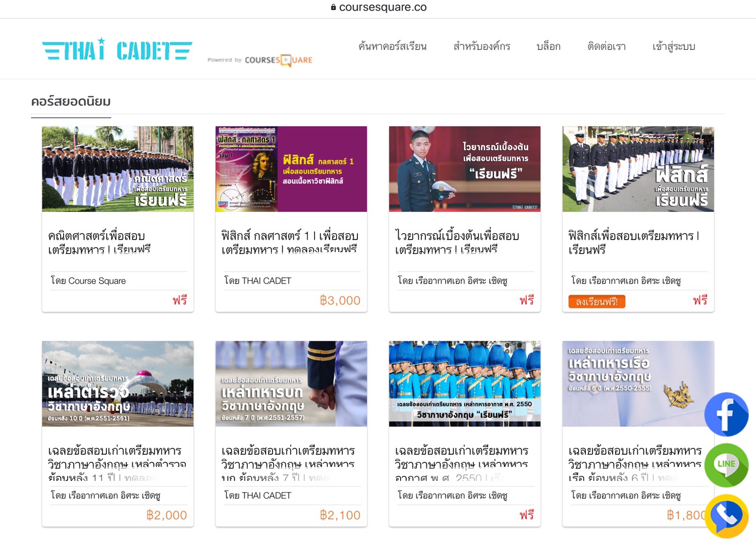 "คอร์สเรียนออนไลน์เพื่อสอบเตรียมทหาร" โดย THAI CADET เพียงเชื่อมต่อกับอินเทอร์เน็ตก็สามารถเรียนเข้าคอร์สต่าง ๆ ได้ทุกที่ทุกเวลา ตลอด 24 ชั่วโมง และเรียนได้ไม่จำกัดจำนวนครั้ง เข้าสู่คอร์สเรียนออนไลน์ ทดลองเรียนฟรีได้ที่ www.coursesquare.co/thaicadet